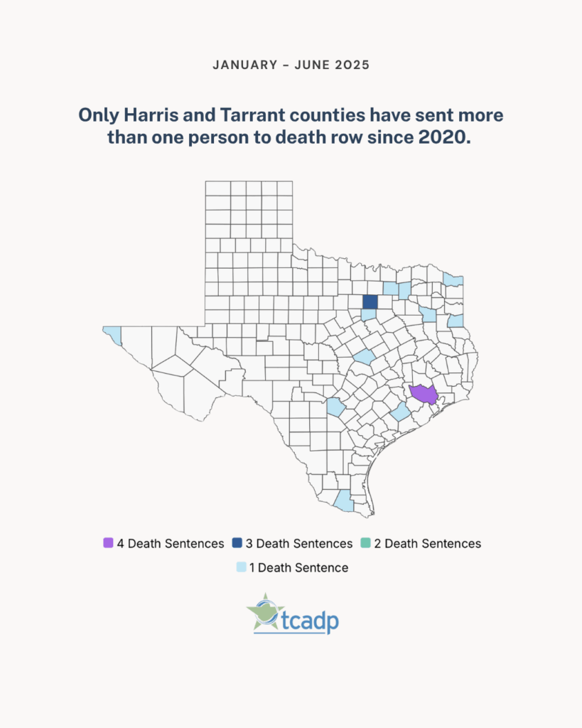 More than half of the counties in Texas have never sent anyone to death row, and death sentences have been concentrated in a few jurisdictions. In fact, six of the last nine people sentenced to death were convicted in either Harris (Houston) or Tarrant (Fort Worth) counties.
