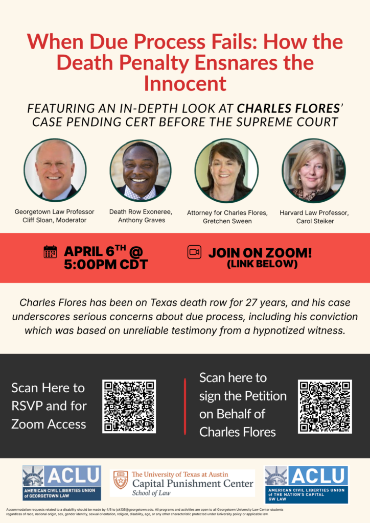 Students at Georgetown Law, in partnership with the University of Texas School of Law’s Capital Punishment Center and George Washington Law, hosted an online panel on Monday, April 6, 2026, at 5:00 PM CT. The discussion examined the case of Charles Flores, which is currently pending before the U.S Supreme Court, and explored the due process concerns it raises.